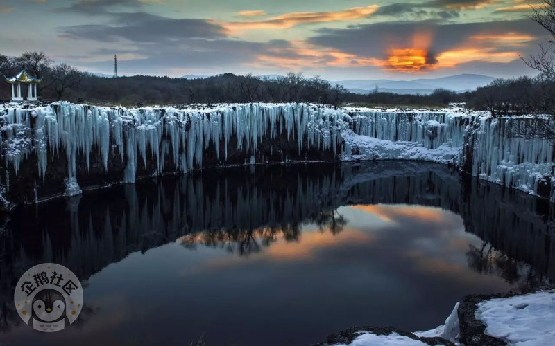 吊水楼瀑布位于牡丹江镜泊湖的北边,成冰的瀑布封锁住了夏日的激情,留下了如雪剑般的冰挂试图直插湖面。