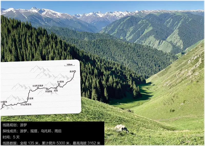 总体来说,这是一条颇有新疆代表风格的穿越路线,草原花海、原始森林、河谷牧道都是典型的地貌特征,而反复过河和翻越冰雪达坂,又是绕不开的难点,故该线路适合有一定经验的体能中等以上的驴友前往穿越。