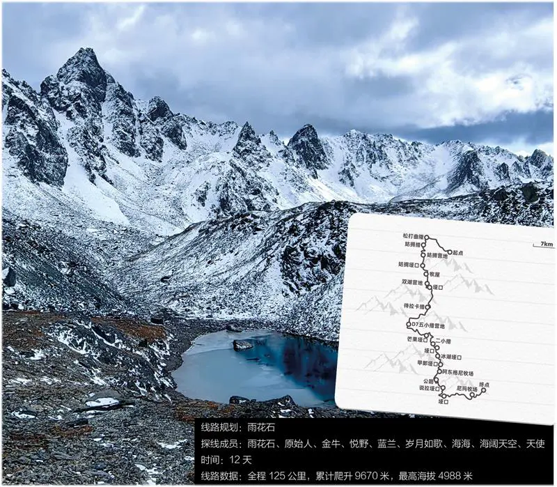 全线海拔较高,沿途全是4600~4900米的垭口,其中连续20公里的大石海令人崩溃。12天里除进出山的两天为成熟路线,中间10天大都属于探路,有的无路可寻、有的路迹不明。其间要翻越15个垭口,有的被厚雪覆盖、有的石海连绵、有的还是巨石林立横亘、有的需要现场判断调整,大多坡陡易滑。