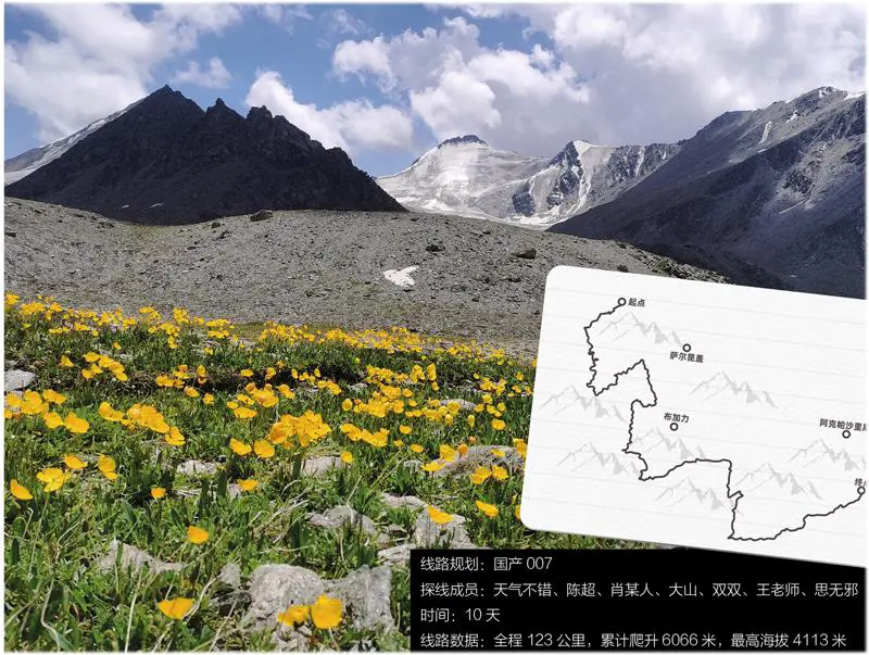 因为大部分路段都有相对成熟的牧道,线路总体来说难度不是很高,主要难点是翻越海拔4114米的冰雪传奇达坂,这个达坂的雪非常厚,蹚雪很耗体能,另外是线路过河点水量较大,一定注意安全。