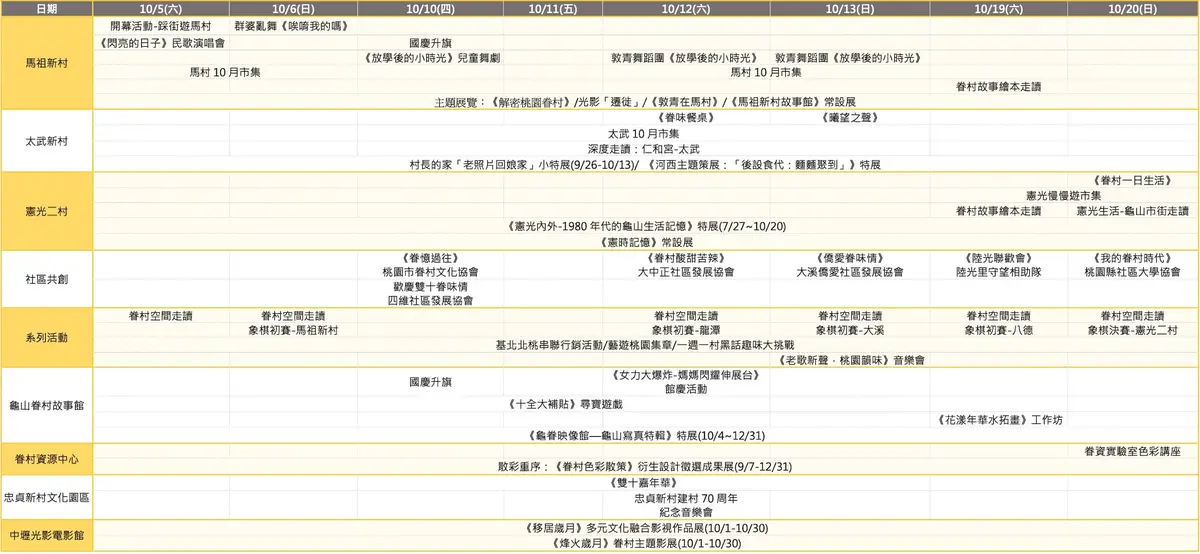 桃園豐富的眷村文化,過去有將近一百個眷村,至今是全台保存最多眷村的城市之一。自2001年開始,桃園年年舉辦眷村文化節,由一系列的精彩活動重現眷村豐沛的能量。今年的眷村文化節將邁入第24個年頭,主辦單位以「共創、記憶活化、解密眷村」三大核心為題,於10月5日(六)至10月20日(日)期間,展開展演、走讀、美食、展覽、市集、工作坊、共創等超過七十場的主題活動。活動場地涵蓋桃園眷村鐵三角(馬祖新村、太武新村、憲光二村)、龜山眷村故事館、忠貞新村文化園區等,共計六個行政區、十二個場域同步登場。