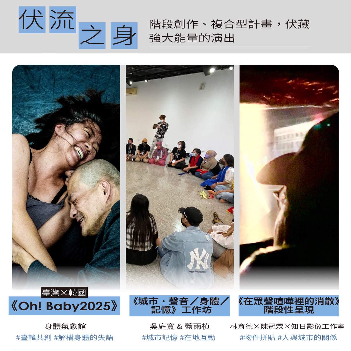 藝術節特別關注文化平權議題,邀請韓國藝術家姜聲國與台灣舞者彭珮瑄共同呈現《Oh! Baby 2025》,從身障者角度重新思考表演藝術的參與權益。同時規劃《城市.聲音/身體/記憶》工作坊,讓移工朋友透過身體語言分享都市經驗。