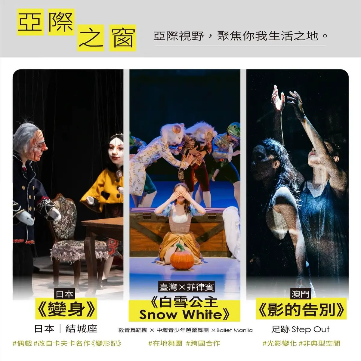 澳門「足跡Step Out」劇團將在米倉劇場及周邊呈現《影的告別》,這場結合光影、魔幻敘事的遊走式演出,帶領觀眾跟隨影子探索城市環境中的光影變化。而敦青舞蹈團攜手菲律賓馬尼拉芭蕾舞團,推出童話芭蕾舞劇《白雪公主》,延續去年《仙履奇緣》的成功經驗。