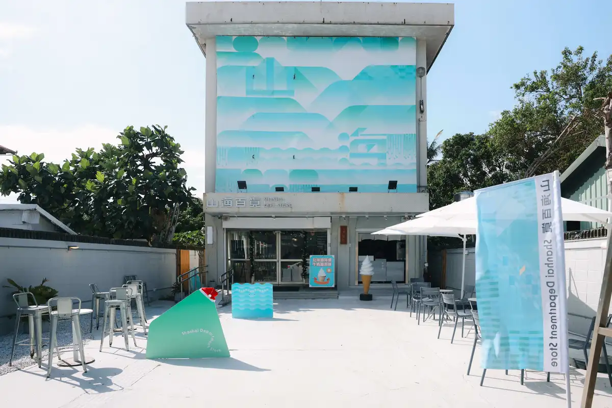 位於太魯閣山腳下,由練習曲團隊策劃,重新改造台電閒置辦公宿舍的山海百貨,在2024年開幕後,旋即成為新城老街上最迷人的建築風景。重新粉刷過的白色小庭院,以及彩繪著藍綠色山海圖樣的正面招牌外牆,清新時髦的設計感,讓人忍不住駐足拍照。