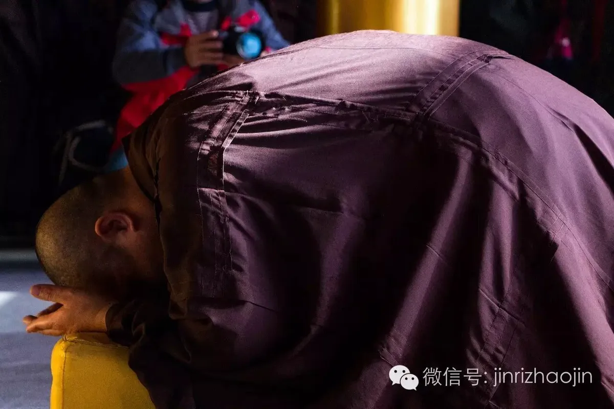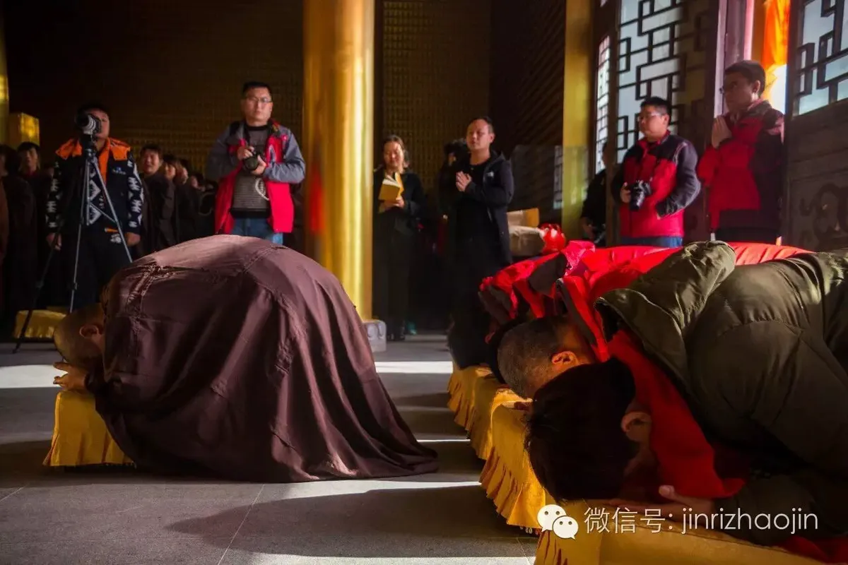 观音肉身宝殿前,善信居士于佛前虔诚跪拜,道场庄严,佛号声声。