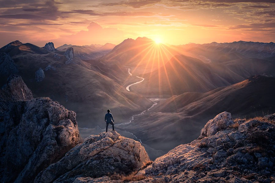 西藏那曲山区的照片,很多人以为是我在北欧拍摄的。其实是我利用卫星地图找到了一段东西走向的河流,而且正好背后就是山峰。到达现场后我又用无人机快速搜索附近的山坡,找到草坡上屹立的一大片岩石作为前景。第二天一大早登山,终于在日出时分拍到了预想中的风光大片。