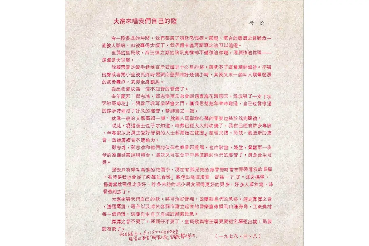 《楊逵:鵝媽媽出嫁》專輯內頁收錄楊逵聲援鄉音民謠推廣的文章。(圖片/朱約信提供)