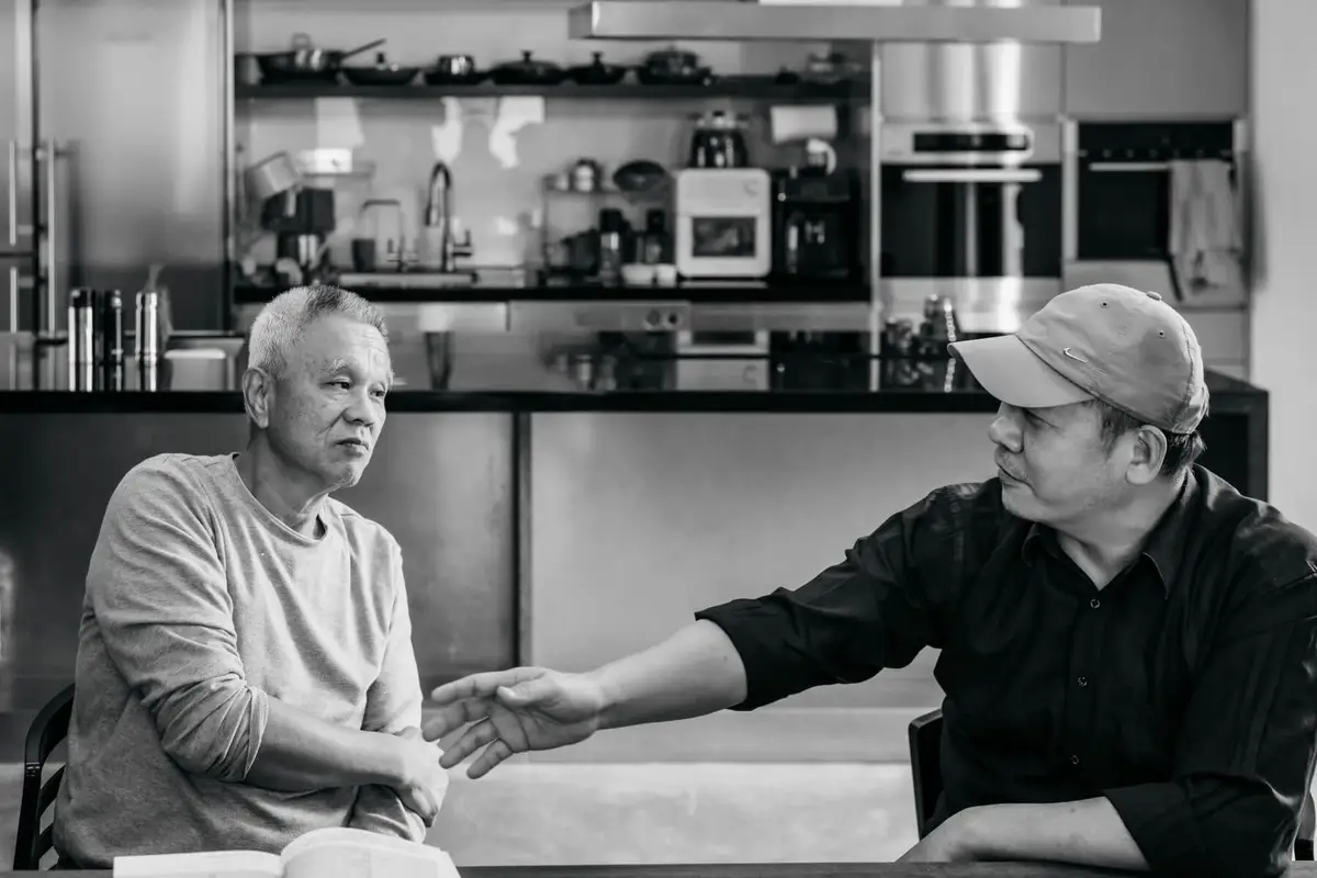 蕭青陽(圖右)與VERSE團隊一同前往劉開居所拜訪,兩代設計大師暢聊《楊逵:鵝媽媽出嫁》的時代意義。(攝影/汪正翔)