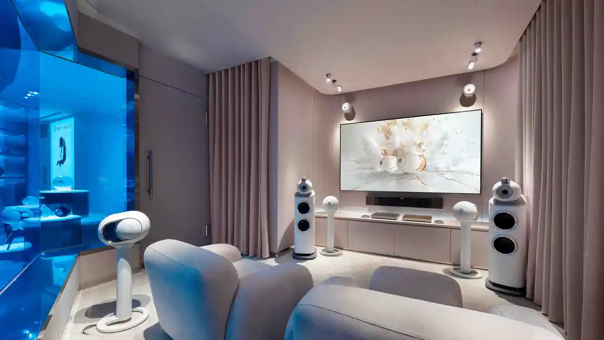 店內的核心亮點,為獨家打造的「藍色視聽室」猶如一座仿彿懸浮於空中的立方體結構,四周環繞柔和光暈,猶如空間中的視覺與聲音座標,引領顧客沉浸於聲音最純粹的本質,開啟對極致聽覺體驗的全新探索。視聽室內另一大重點,是導入了今年3月全新發表的Devialet Astra綜合擴大機。這款產品凝聚Devialet歷時15年的研發成果,為品牌迄今最先進的高階音響系統,台北101旗艦店也成為Devialet Astra首度在台公開展示與體驗的據點。