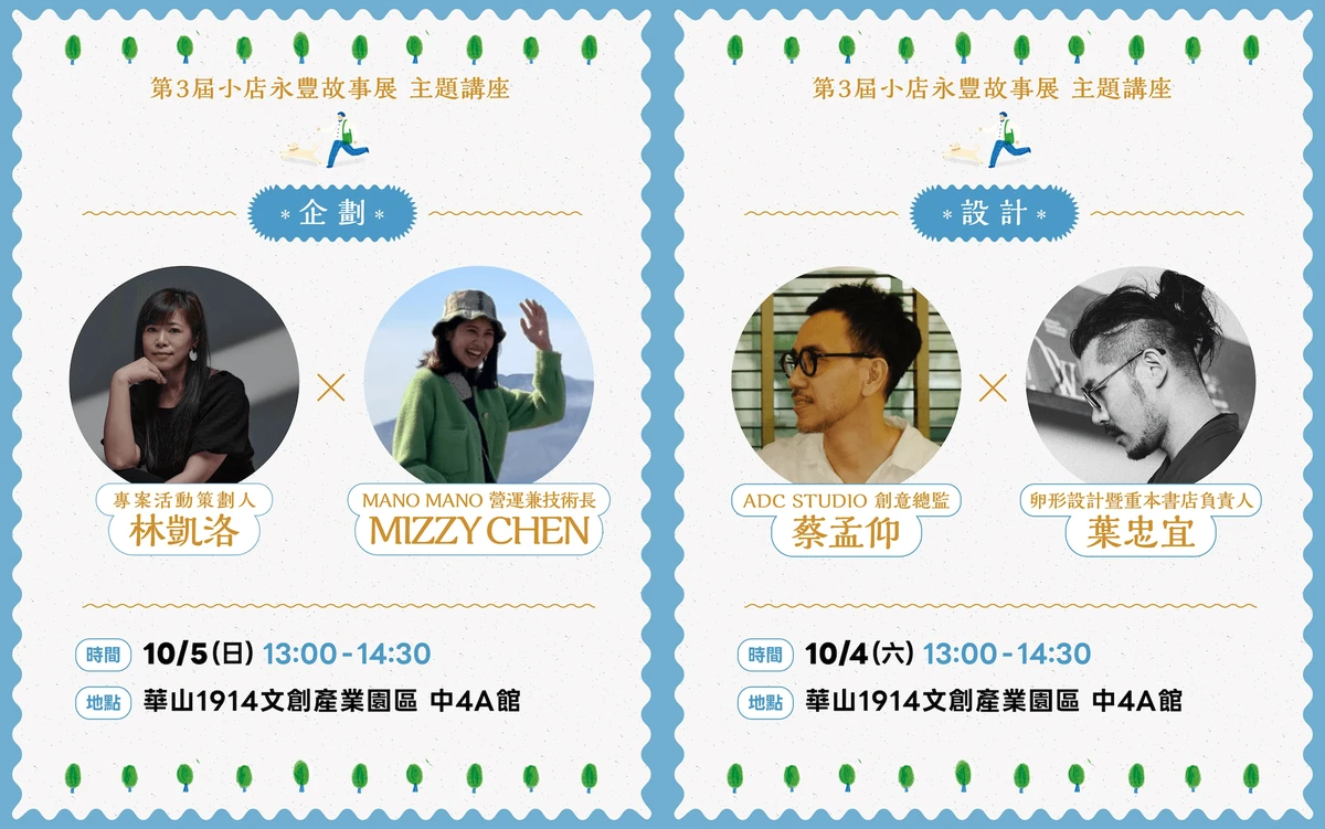 現場特別舉辦2梯次「小店主題講座」,從設計與企劃兩大主題切入。設計場邀請ADC STUDIO創意總監蔡孟仰與卵形設計暨重本書店負責人葉忠宜,分享為客戶做設計到經營品牌開店的換位思考;企劃場則由專案活動策劃人林凱洛與MANO MANO營運兼技術長MIZZY CHEN,從創立品牌到打造完整體驗,深入探討企劃歷程。