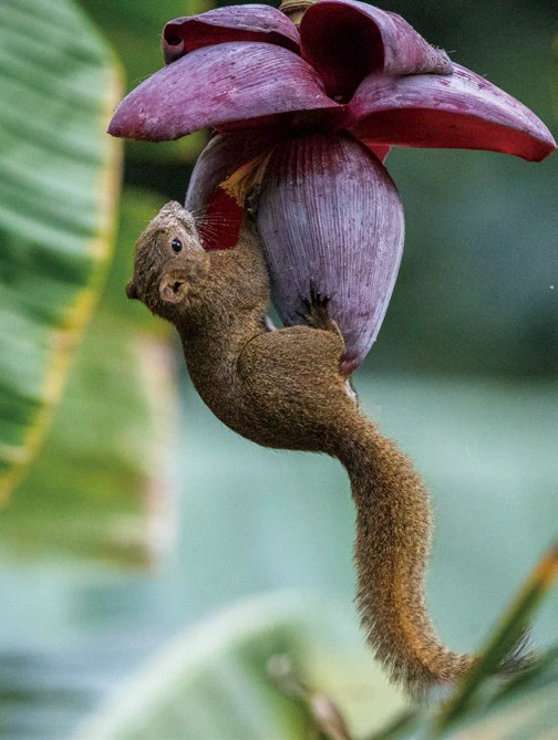 除此之外,高黎贡山的啮齿类动物也不在少数,各类鼠科动物也很常见。树狗巨松鼠是松鼠界的巨无霸,成体“身高”可超过1米,体重可达3千克,体长超过40厘米,尾长可达60厘米,背部、四肢外侧和尾部的黑色或乌黑色皮毛异常耀眼。树狗性格温顺,活泼好动,在树梢上自娱自乐时,会将长长的尾巴垂下来,觅食时会用尾巴勾住树枝,侧身去取食树梢上的花蕊或果实。