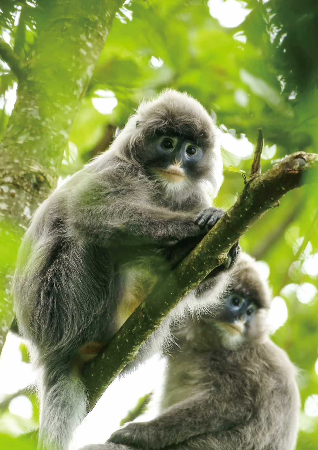 活跃在林木之间的其他灵长类动物同样神奇。“大眼萌猴”菲氏叶猴在宝宝时期是灿烂的金黄色,到3个月左右时,逐渐“换装”成银灰色。身着银灰色“长袍”的肖氏乌叶猴,眼睛是令人惊讶的黄橙色。2011年发现的新物种怒江金丝猴通体黑色,耳朵、脸颊有少量的白毛,最具特色的是它们丰满性感的红唇和上翘的鼻子。下雨时,雨水会顺着“朝天鼻”流进鼻孔,让它们忍不住打喷嚏。所以,怒江金丝猴会在雨天排排坐,把头埋在两膝之间,让人忍俊不禁。