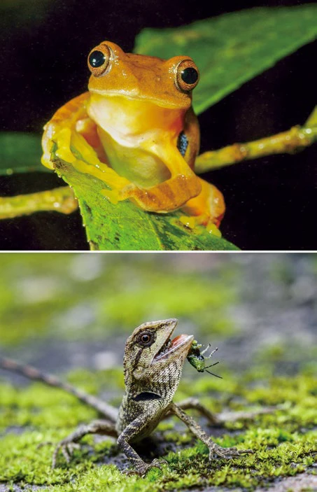 红瘰疣螈是这里的“明星动物”,体表脊背两侧各有一排艳丽的橙红色或棕黄色的凸起小疣,加上同色的头和尾,样貌非常漂亮。小巧的雨蛙和掌上有吸盘、可以爬树的树蛙也十分受人喜爱。缅甸树蛙通体碧绿,常在山地溪流附近出没,捕食小型昆虫。到了繁殖季节,它们会顺着树干攀上树枝,在树叶、树枝的缝隙间产卵。顺着喧闹的蛙鸣声,科学家们总是会目睹它们的“婚礼现场”。