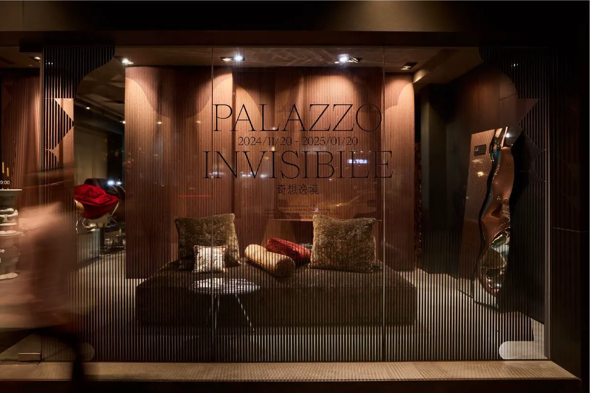 另一件靈感來自米蘭大教堂建築立面的「Milano 米蘭椅」,由Jacoppo Foggini設計,其高瘦的外型、條紋質感以及偏暖灰的色調,以聚碳酸酯為主要材質,在光線下可以折射出從透明到灰色之間的清澈光線質地,充分展現了材質之美。另一款「Standard」沙發深色皮革版本,則呼應著展覽主題「Palazzo Invisibile 奇想逸境」呈現的浪漫空間。
