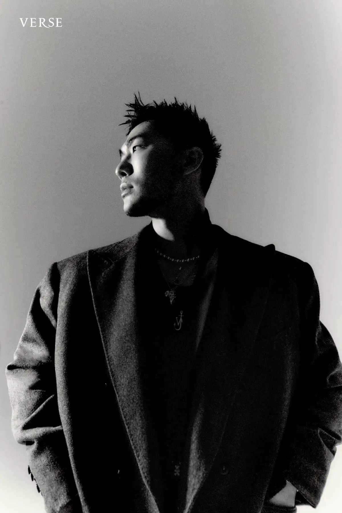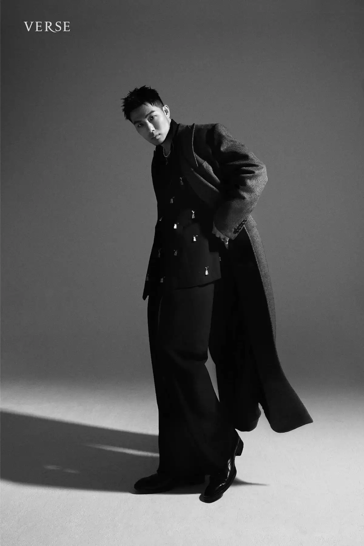 在寬鬆舒適、運動服飾當道的此刻,凱文嚴守自己的穿衣準則,他的封面造型選擇了一身tone on tone、帶有oversize感的正裝+大衣造型,主要的雙排扣黑西裝上鑲滿吊飾元素,打破常規,強調鬆弛感的輪廓也更貼近當代潮流,即便一身黑也充滿層次感。