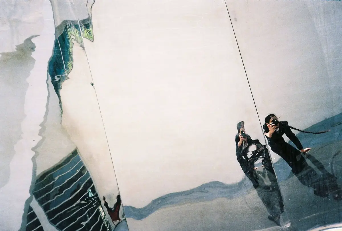 悠遊於南美館時,林奕嵐想像自己是《阿達一族》的大女兒Wednesday,冷靜又略帶厭世的慧黠;待在小型藝廊空間時,她設定自己是機器娃娃,極度冷靜卻對世間萬物保持好奇;在漁光島,她想起童話裡有了雙腿可以上岸的小美人魚,落日餘暉映照在她身上,鑲成金色的輪廓。