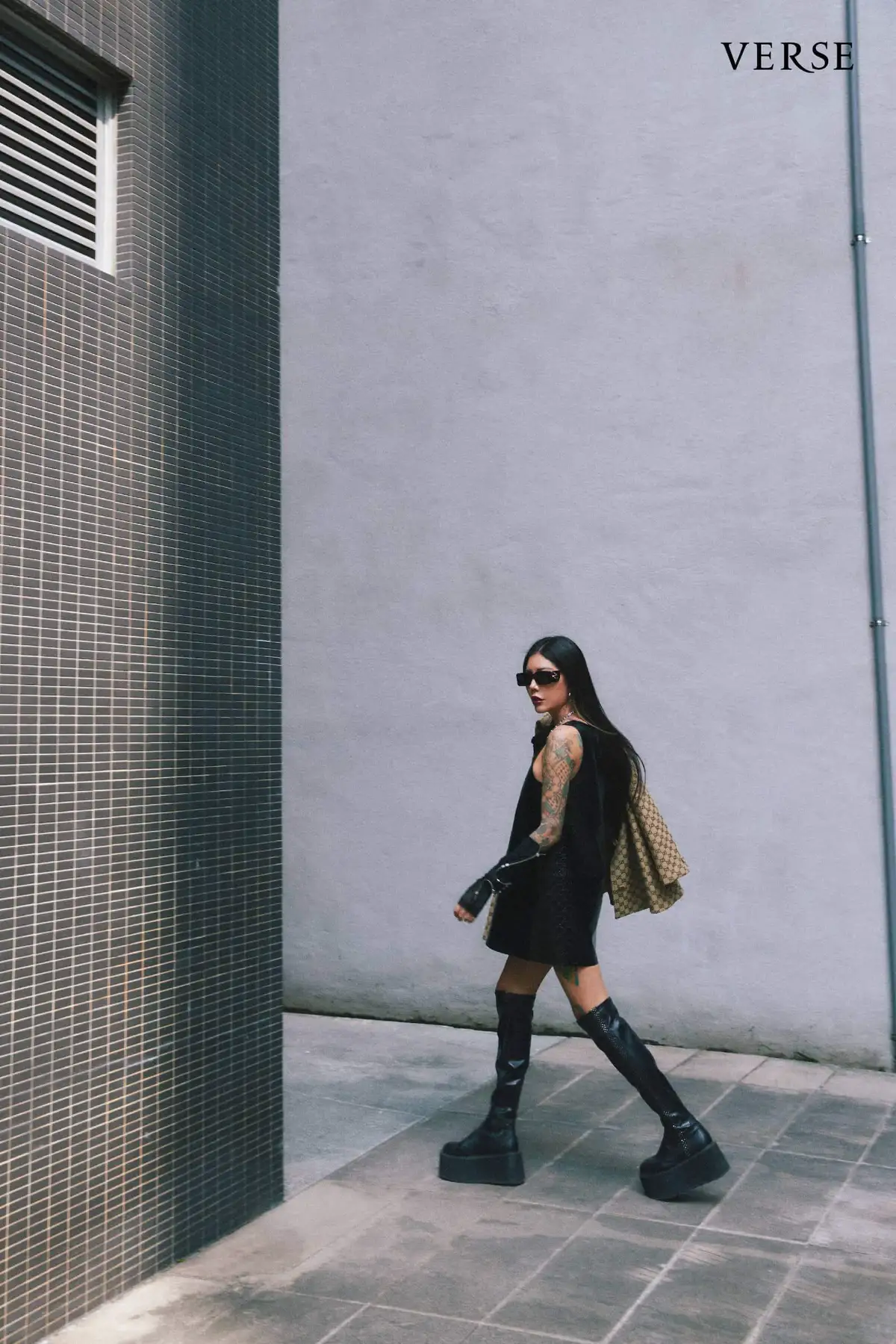 百勒絲身上的標誌性時尚元素不少,她個人的最愛是厚底鞋,「自從國中的時候接觸到厚底鞋就一穿愛上,愛到現在。因為厚底鞋可以把腿的比例拉長,穿什麼衣服都好看,所以我有各式各樣的厚底鞋,連涼鞋、球鞋都要穿厚底的。」另一個時尚竅門是帽子,「造型完後,如果好像還缺了點什麼,我就會搭配帽子,帽子是很有畫龍點睛效果的配件。」還有她經常穿著、特別鍾愛的黑色,「我覺得黑色是非常神奇的顏色,能夠讓人感受到獨特的力量和魅力。我會用各種不同的配件和飾品去做點亮,就能夠展現出不同的氛圍和風格。」