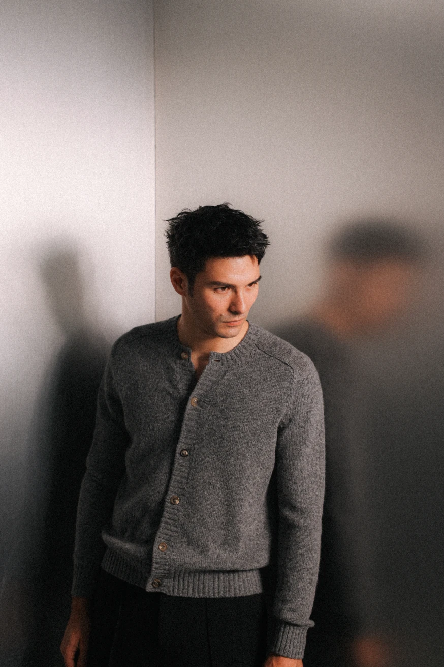 (左)灰色羊毛開襟衫、黑色羊毛長褲 by Prada;(右)漸層羊絨圓領毛衣 by Berluti