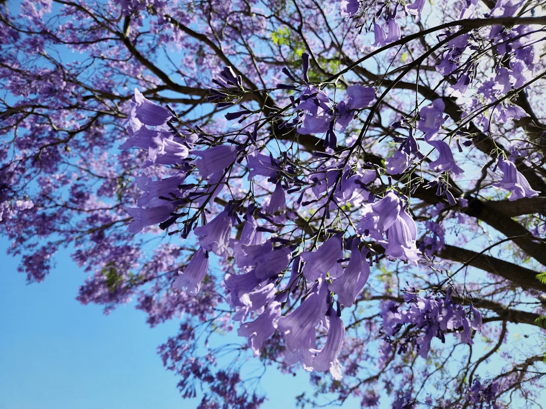 機場附近也有藍花楹的大樹綴滿大朵紫花,但是從高速公路南下自威斯坦街進入托倫斯大道後,本地人稱為「紫櫻花」的這種美麗花朵的色彩變得更濃豔。