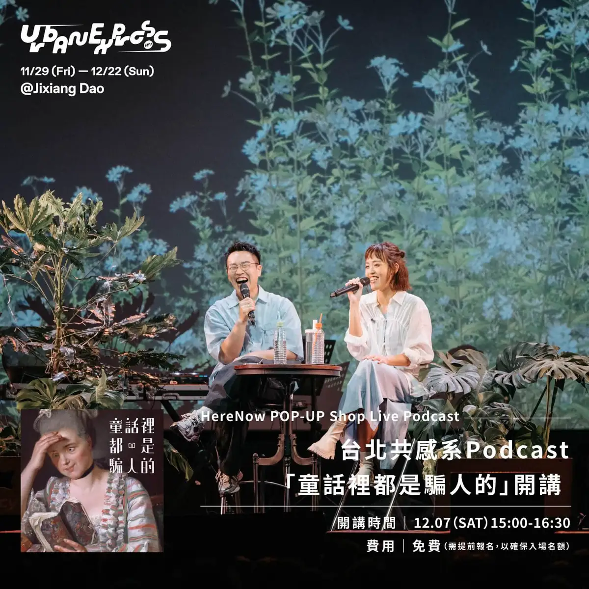 HereNow積極透過各種藝文工作者視角看見城市裡的文化現況,剖析日常中細微且仍在發展中的新趨勢,包括近年多元包容的Podcast浪潮,聽進屬於台灣的當代議題。本次台北邀請共感系Podcast「童話裡都是騙人的」於12月7日以Live Podcast形式現場開講,暢聊「旅行的美好都是騙人的!?」展現專屬台式跨越文化的幽默感。
