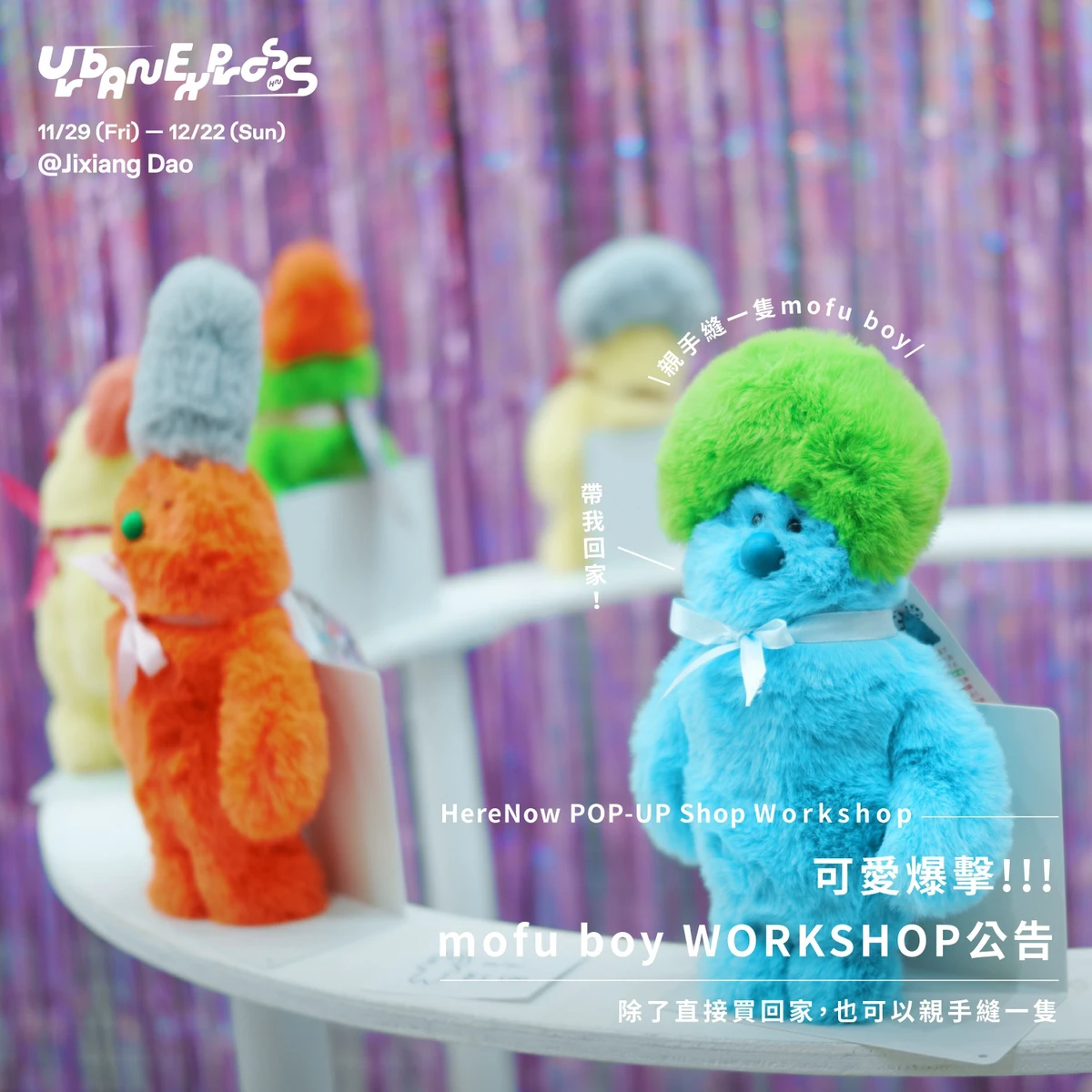 從日本起家,HereNow平台以中日文雙語展開,擅長洞察日本文化前線動態。在豐沛的創作靈感中,力邀東京藝術家Chiyoda,帶著毛絨娃娃品牌「mofu boy」來台首度亮相。透過布料和縫紉創造出的溫柔療癒感,每隻娃娃都是世上獨一無二的存在。除了實體販售外,藝術家Chiyoda也將於11月30、12月1日親自來台帶領限量手作課程,重現東京秒殺的抽選制WORKSHOP熱門體驗,現場提供不同顏色、形狀與布料,手把手教學藝術家等級的手工毛絨娃娃,感受迷人時髦的東京手作魅力。