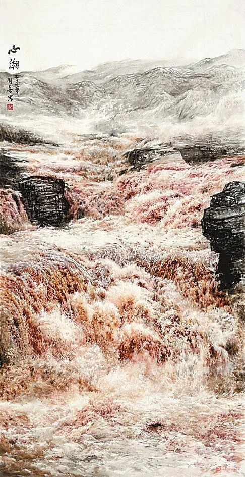 对于这位并不年轻的画家来说,如今更是惜时如金。曾为画一幅画,他夜晚就躺在临时铺的床板上,裹着被子入眠,短暂休息过后继续潜心作画,每一个细节、每一处色彩,都做到准确、出彩。他创作的入选2015年全国中国画展的作品《心潮》,同样是画壶口的场景,奔腾的黄河,澎湃的急流,震撼人心,似乎能够听到轰鸣的黄河水撞击两岸石头的巨大声响,令观者沉浸其间生发出美的感受。