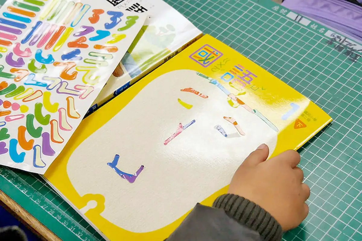 馮宇為第二季美感教科書設計一年級的國語課本,提供貼紙讓孩子自由創作課本封面。