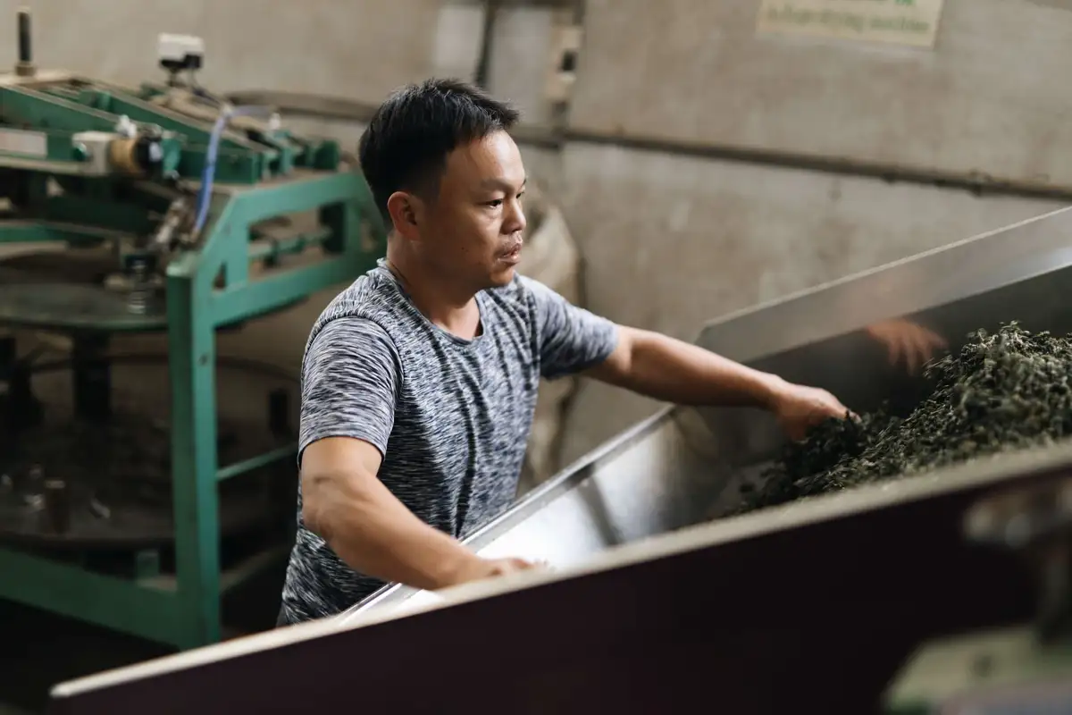 站在製茶廠中央,葉盈德帶領兩名茶工一起做秋茶,乾燥機大肆發出噪音轟隆隆運轉,秋茶粗胚一撮一撮落下,在布巾上堆成小山,未完成的茶胚散發出熏人的草本氣味。