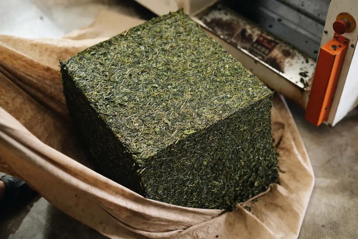 說完,他把殺完菁的茶包在布巾裡,拋入名為「豆腐機」的新型壓茶機,不一會兒機器便吐出一塊綠色大正方體,葉盈德將其反覆打散、壓制,取代了傳統布球揉捻,使茶葉塑成球形。而這套設備新穎的製茶廠,是他與哥哥應允接手家業時,父親決定擘畫擴建的,翻新起造的時間大約在二十年前,但期間設備不停汰舊換新,才成為今日的樣子。