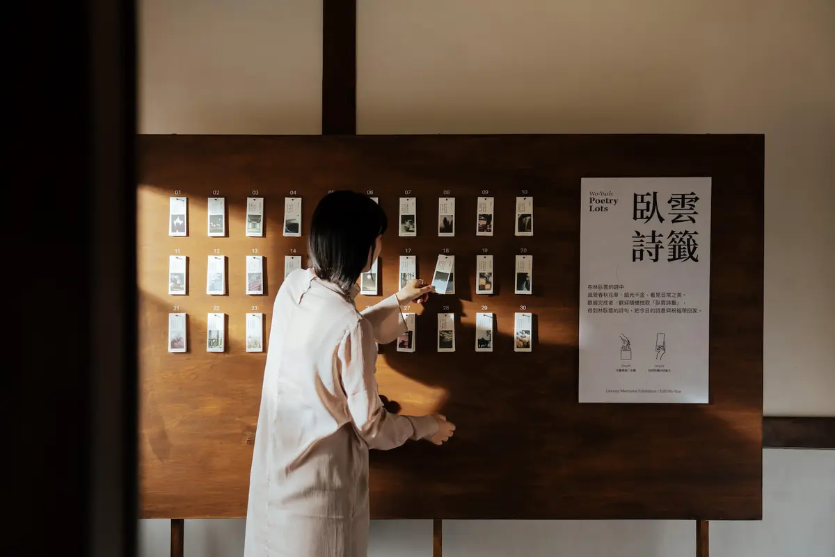 展區「臥雲詩籤」從林臥雲作品中,挑選嘉義在地、節慶相關之作品,總共有36首中、英文版籤詩,讓觀者可將臥雲詩籤帶回到生活裡。