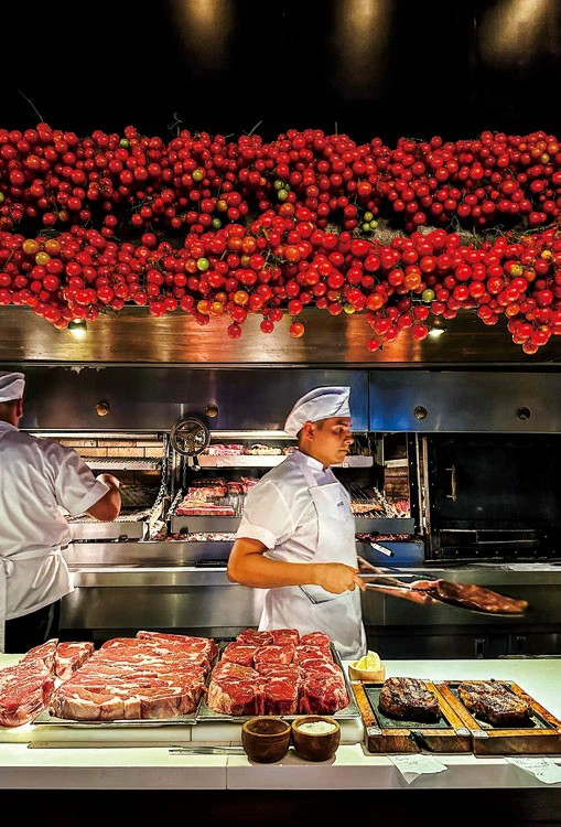 走进唐·朱利奥餐厅,就能看到一个硕大的烤架,各种部位的牛排、牛胸腺、血肠,以及西葫芦、茄子……都在烤架上被烈火炙烤着,一瞬间,我也仿佛沐浴在炭火和肉香之中。身着白色制服的厨师们分工明确,有条不紊地在烤架前忙碌。一盘盘烤得恰到好处的美食被放到吧台,再被端去相应的餐桌,而那些早已迫不及待的食客操起手中刀叉,切下一大块牛肉塞进嘴里,咀嚼,满意地闭起双眼……这副场景,形象地解释了为什幺大家都说唐·朱利奥是一座美食圣殿。