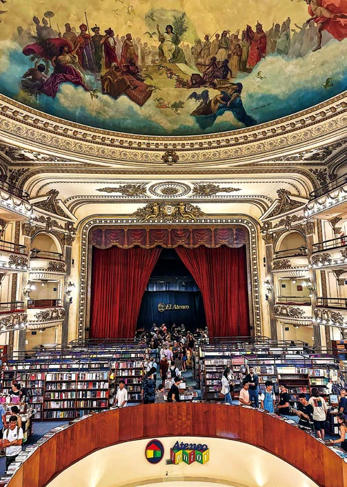 我来布宜诺斯艾利斯之前,就听闻了不少关于这座城市的传说。来了之后,除了美味的烤肉,还有一个发现:布宜诺斯艾利斯,这是一座开满书店的城市,随处能感受到当地人对于图书的热爱和对知识的尊重。我专门去了那家着名的“雅典人书店”,它曾被评为全世界最美的书店之一。看到店内一个个畅游在书海里的人,我又想到了博尔赫斯在《天赐的诗》中所写:“我一直都在暗想,天堂应该就是图书馆的模样。”