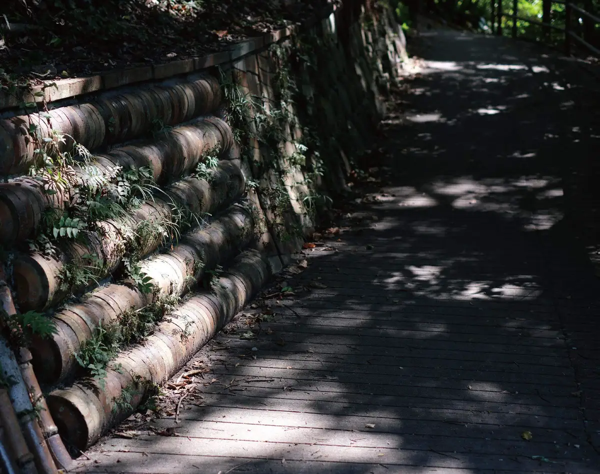 我們沿著窯垣小徑走回停車場,陽光穿過林木,幾團光暈落在以燒陶道具拼成的擋土牆上,花草仍未長盛,顯得草叢裡用來防雜草生長的塑膠網尤其礙眼。金森跟我說著他與瀨戶的淵源,這個千年的陶鄉曾是他上大學的必經之地,幾乎每天往返,他卻從不知道窯垣小徑的存在。「如此獨特的風景,該好好維護。」他說。
