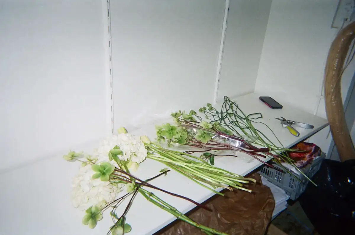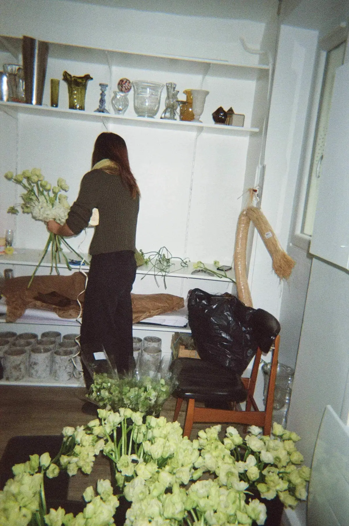 近幾個月,為了觸及更多人與可能性,想想專注於經營自己的品牌。但她目前只負擔得起與別人合租的工作室,屬於自己的這半放一張簡簡單單的桌子就近乎填滿:不像她不受規訓的花藝風格,想想骨子裡的某處始終老派,堅持哪怕再小,總是要有個工作室才足以維繫專業形象、對客戶交代。每次逛巴黎的花市(當地花藝師都會去的「Rungis Market」)也簡直像打仗,「必須凌晨4點一開門就到,花材再多都要自己租車自己扛,一回來又要馬上開始理花、做花、聯絡快遞出貨、休息一下又要再出去佈置展場⋯⋯」想想的眼神難得流露一絲狼狽,「真的滿累,我已經兩天沒有睡。」
