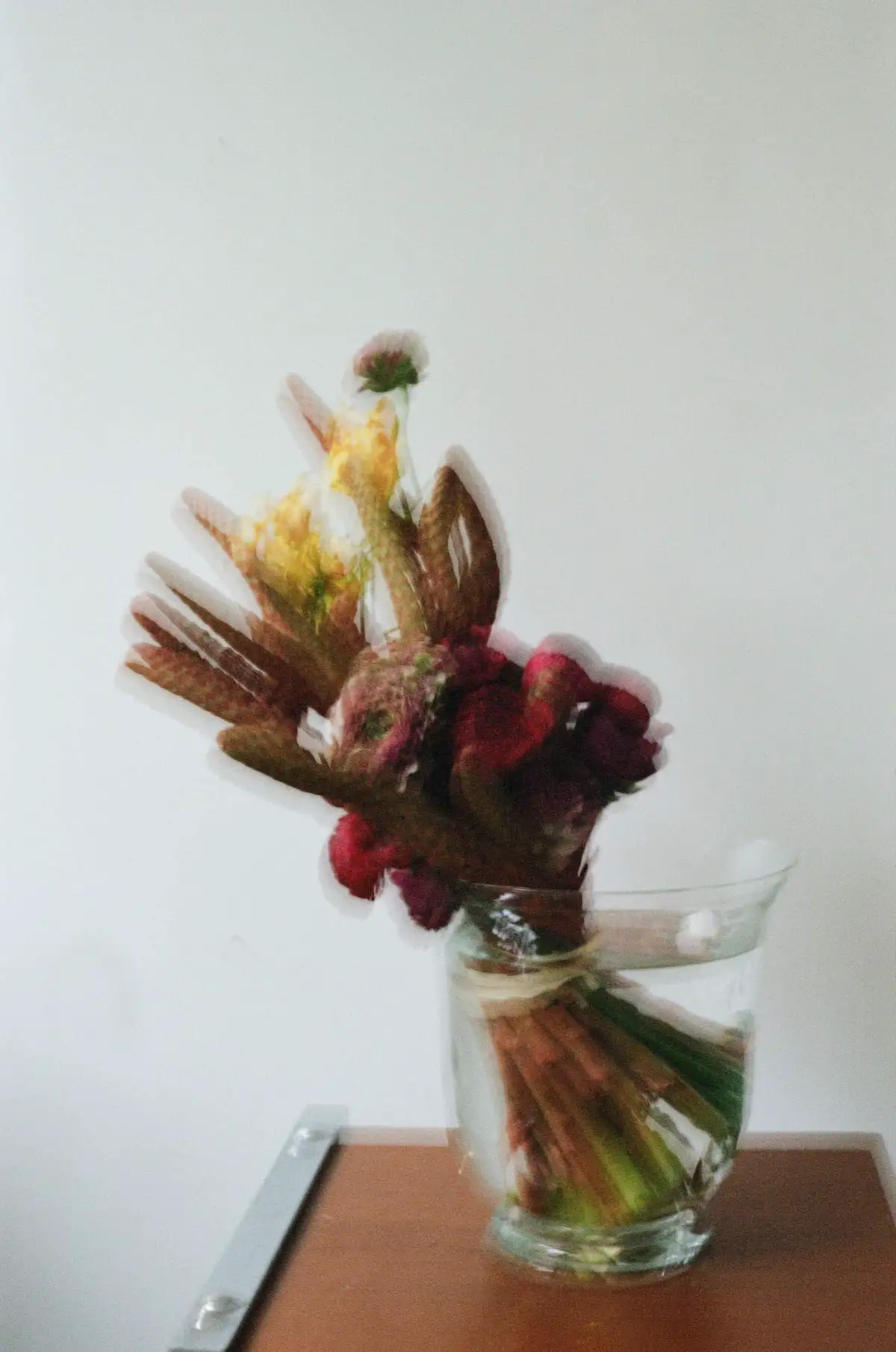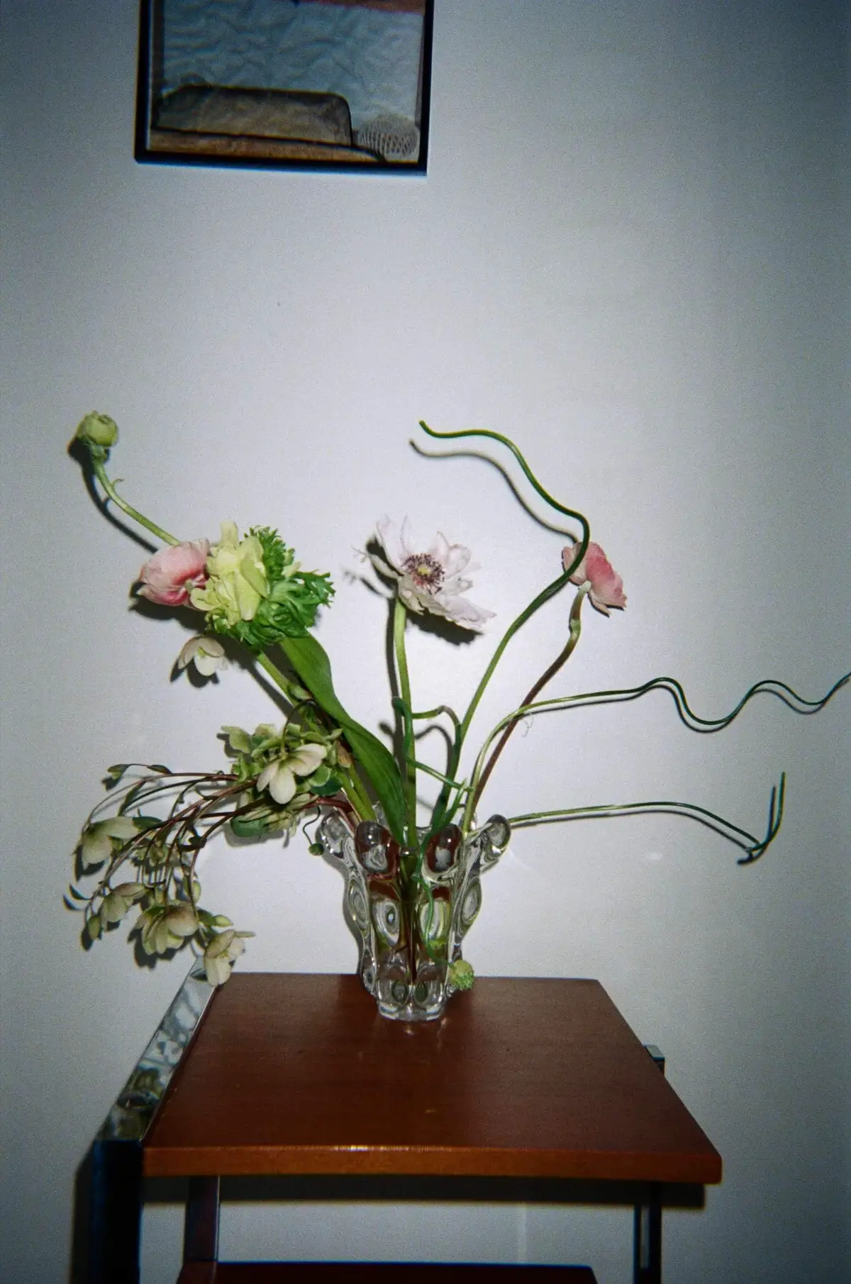 大學時,家附近的市場裡有間小花店,沒有人氣的安靜夜晚,路過的她總忍不住走上前和獨自顧攤的爺爺聊聊天,花不多的錢,捧兩、三枝可能是火鶴、桔梗、滿天星、雞冠花、菊花⋯⋯回家。隨著花朵從含苞、盛開,到花瓣掉落或完好地乾枯,「我開始可以感受到它們每天轉變的不同、整個生命的過程,慢慢就會覺得⋯⋯身邊有花滿好的。」