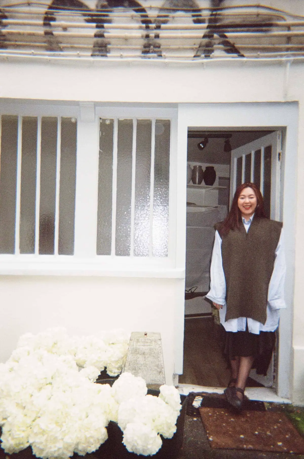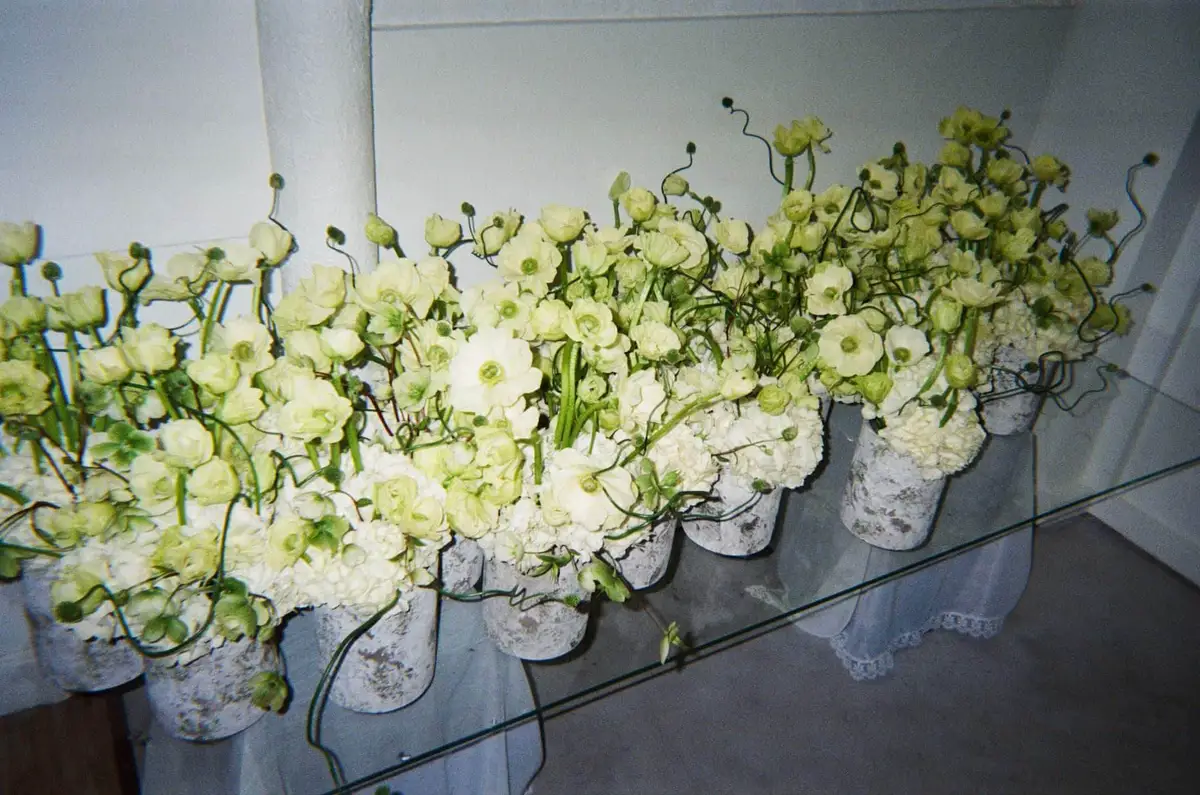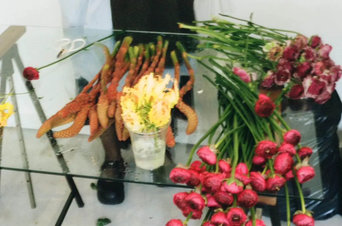 如同訪談前一天,想想剛綁完的一束很重要的花——由攝影師Jordan Hemingway和女友英國歌手FKA twigs下訂,送到時裝設計師Simone Rocha為Jean Paul Gaulier客座設計的2024巴黎高級訂製時裝秀現場——她慎重地精挑細選了三種花材:豌豆花、混色玫瑰和黃綠色的拖鞋蘭,向品牌一貫以香檳、粉紅、白色與米白色的風格致敬,也巧妙呼應本季作品中一件亮眼的綠色蓬蓬洋裝,「我用花瓣像紗般穿透的質感,撐出那件蓬蓬裙的形狀和光暈。」