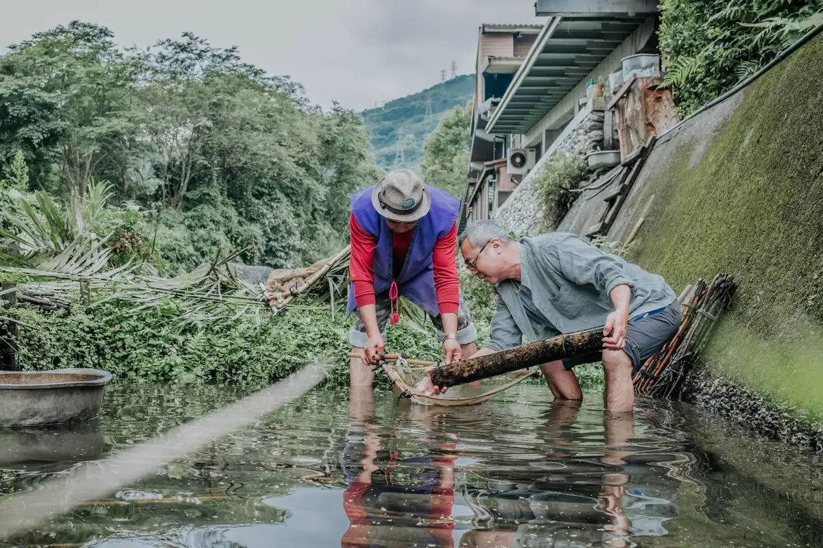 巴拉告有三層設計,最底層會鋪設中空大型竹筒,讓鰻魚、鱔魚等習慣棲息在河川底層的魚類停留。中間是成捆的九芎樹枝,讓小魚、小蝦得以附著在上面。最上層是空心竹筒,聚集不少溪魚。只見工作人員拍打樹枝,生氣蓬勃的魚蝦跳進捕魚網,等著上桌成為「石頭鍋」中添味的魚鮮。