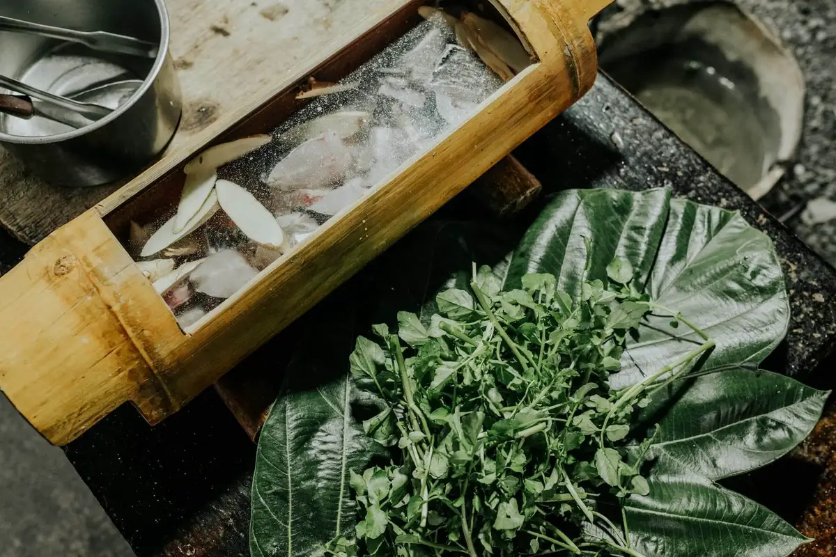 園區餐桌上的種種珍饈,不只是在地農民的心血結晶,也是食農教育的最佳教材。阿美族的傳統烹調料理之一為石煮法,先將洗淨的石頭丟入火堆燒到700度,接著以巨竹或檳榔葉鞘作為容器,放入新鮮魚肉、水田芥再將火紅石頭放入湯中,瞬間湯水沸騰,魚肉的鮮甜圍繞鼻間。
