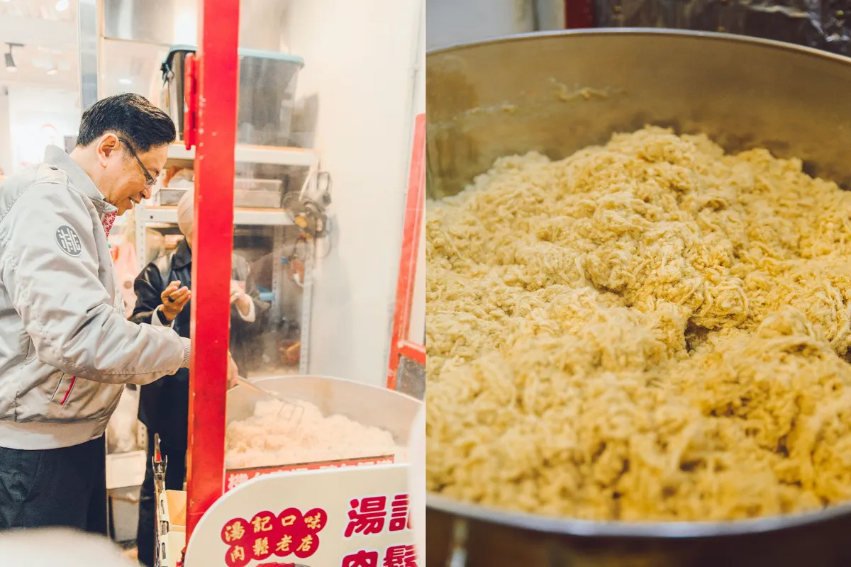 在大同路上,「湯記口味肉鬆」老店傳出陣陣香氣,門口烘著新鮮的肉鬆,目前已傳承由第三代老闆娘──湯玟琪女士經營,湯老闆專業介紹起自家肉鬆,也邀請走讀團隊一同加入製作;湯記本身經歷甜湯、愛國獎券、柑仔店(雜貨店)到今天肉鬆及肉乾專營店的產業轉型,成為街區實力堅強的老舖。