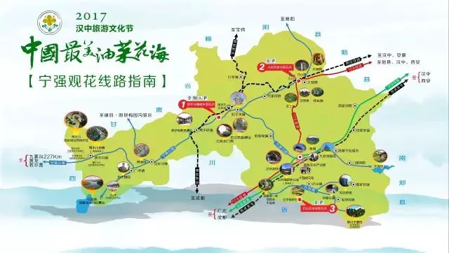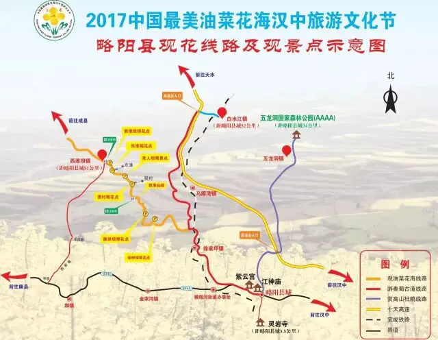 2、从十天高速方向去的观花海线路:十天高速勉县北出口——县城——天荡山——武侯祠(旱莲文化节)——诸葛古镇——武侯墓(诸葛亮文化旅游节)——定军山——西汉高速勉县引道——元墩镇喇家寨村观花点——阜川镇李家湾村观花点——西汉高速勉县出口。