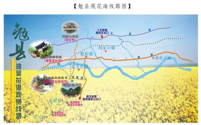 1、从西汉高速方向去的观花海线路:西汉高速勉县出口——元墩镇喇家寨村观花点——阜川镇李家湾村观花点——西汉高速勉县引道——返回。