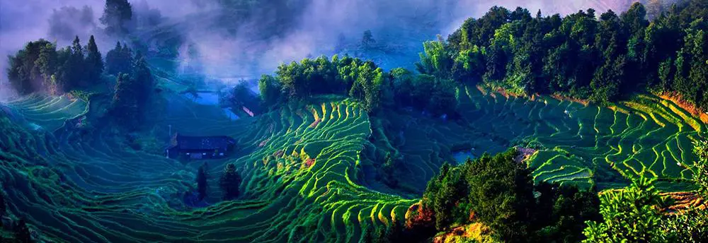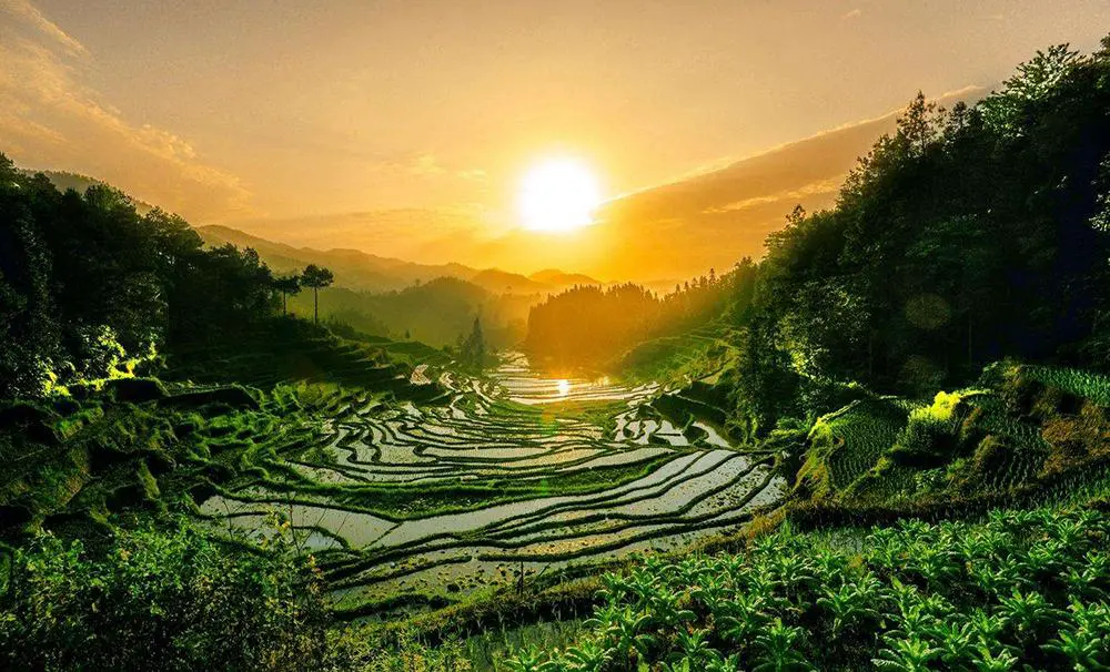 在新化紫鹊界,有一片梯田景观,与广西龙胜梯田相比,规模更大,时光更古老,秦朝时就已开建。如今,这片被历史尘封太久的稻作基地,逐渐以它不可抗拒的大美,走向了人们的视野。这里是真正的梯田王国,8万余亩梯田沿山而造,集中连片的就有2万亩;站在山顶,放眼望去,梯田层层叠叠,小如碟,大如盆,长如带,弯如月,辗转盘旋,气势恢弘;春意里绿染江山,秋收时黄金满地。