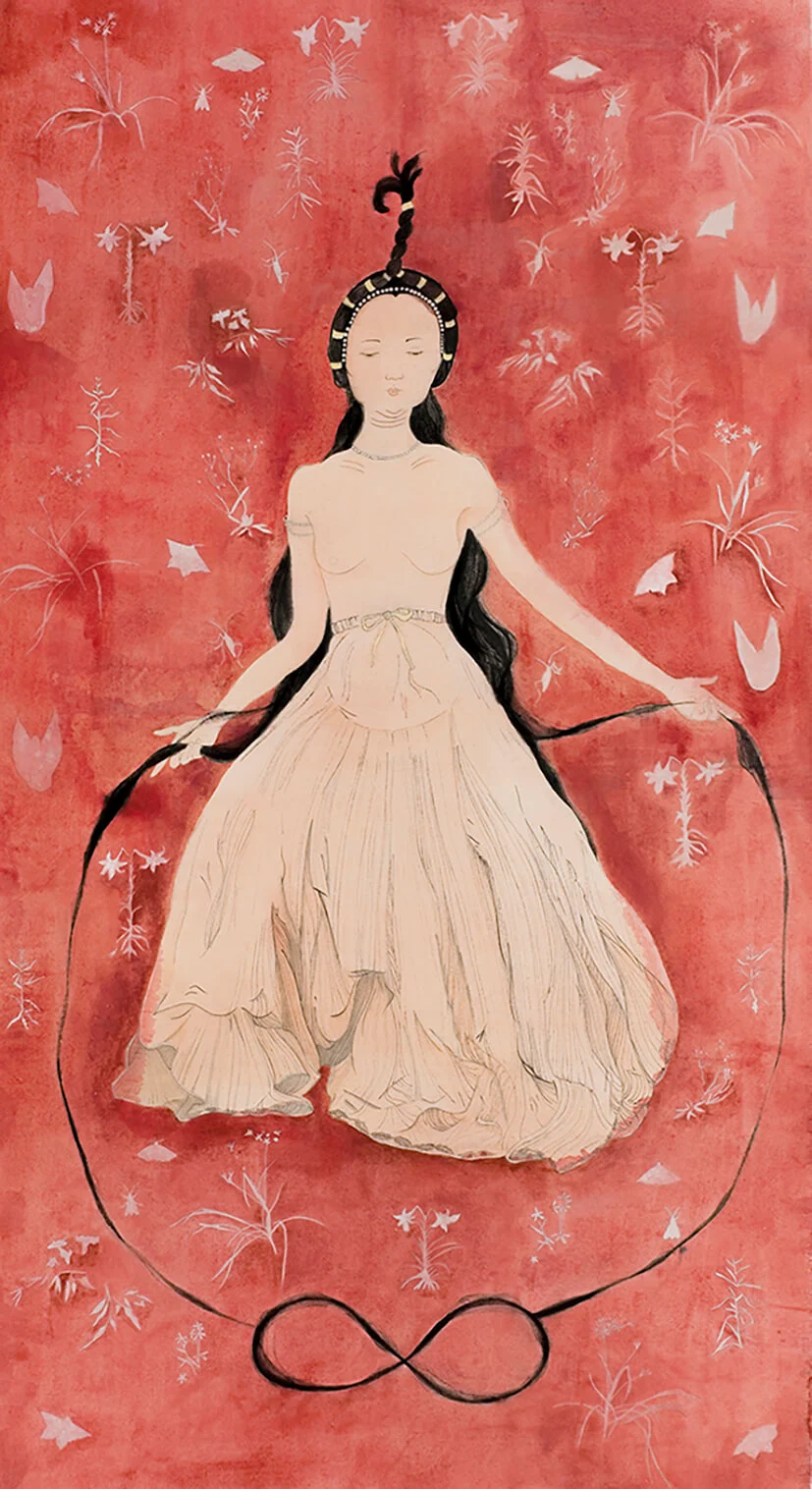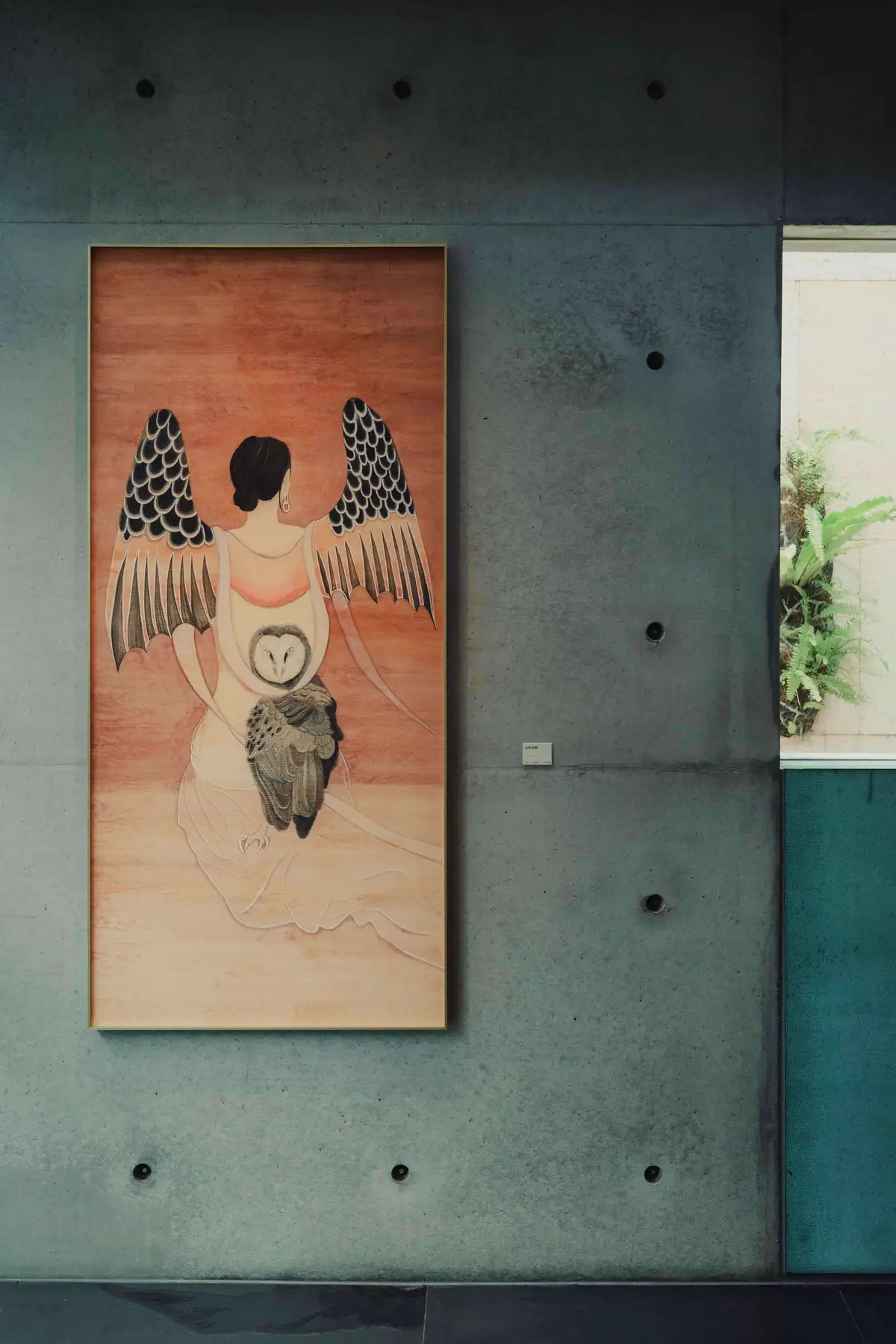 因此她所描繪的女性人物,帶有東方文化對女性神明的想像,並加入了來自埃及、美索不達米亞等古文明的女性神祇形象,以及神話裡常出現的符號,如羽翼、獸首、繭狀身體——象徵女性力量的流動性與自我再生。這樣的視覺語法,使她的創作不僅是個人生命的書寫,更是文化符號的再生與重組。