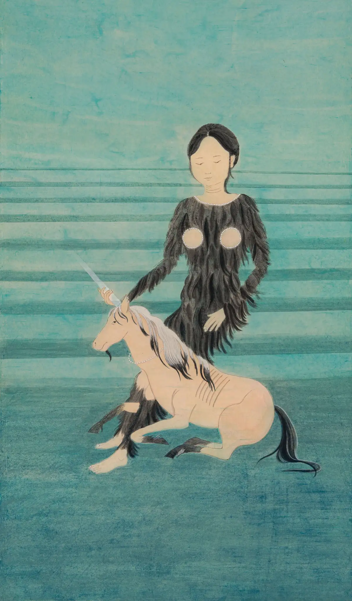 畫中的女性正在與獨角獸玩耍,而不是一個捕獵的誘餌工具,相反地,她才是掌握權力的人。「所以她原本狂野的頭髮,變得優雅美麗,身上也穿著美麗的衣服。」透過這樣的形象反轉,展現出女人是自我的主人。她還將使用傳統中國繪畫中描繪瘦削、有精神的「瘦馬」形象筆觸,勾勒出獨角獸身上的紋路,成功將兩種不同的文化元素,融合在這幅作品之中。