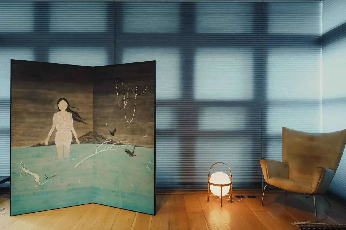 除了錄像作品,展場內的巨型水墨屏風創作也成為焦點。這件作品的主要靈感,來自她居住的公寓旁的一條河流。透過這條河,她重新詮釋了西方神話中的女性角色——「海妖」(Siren)。
