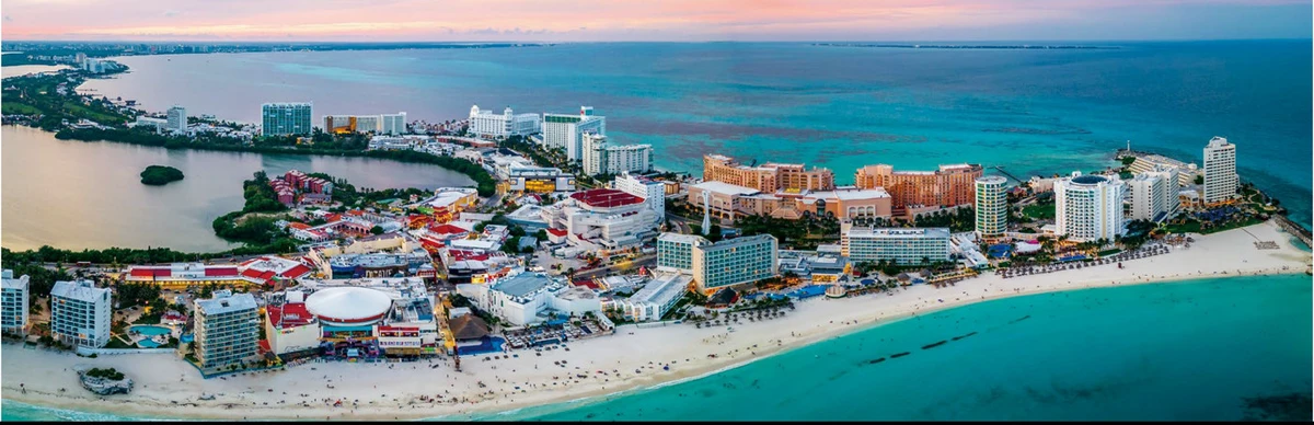 坎昆位于尤卡坦半岛东北角,是金塔那罗奥州最大的城市,也可能是全墨西哥最现代化的旅游城市之一,毗邻加勒比海,靠海的一侧是一条狭长的7字形半岛,被建成酒店区,供人们度假,每年冬天都会吸引大批北美游客——古巴危机后,这里成了美国新的后花园。