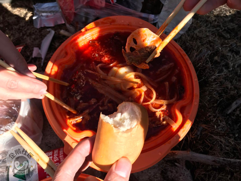 不一会火锅好了!因为海拔的因素,粉煮的还有点硬。将就吃吧,瑟瑟寒风,有这么一盆火锅真是雪中炭般的温暖,而且都吃的很开心哈哈(对了吃完的垃圾一定要清理哦)好了,吃完继续赶路。