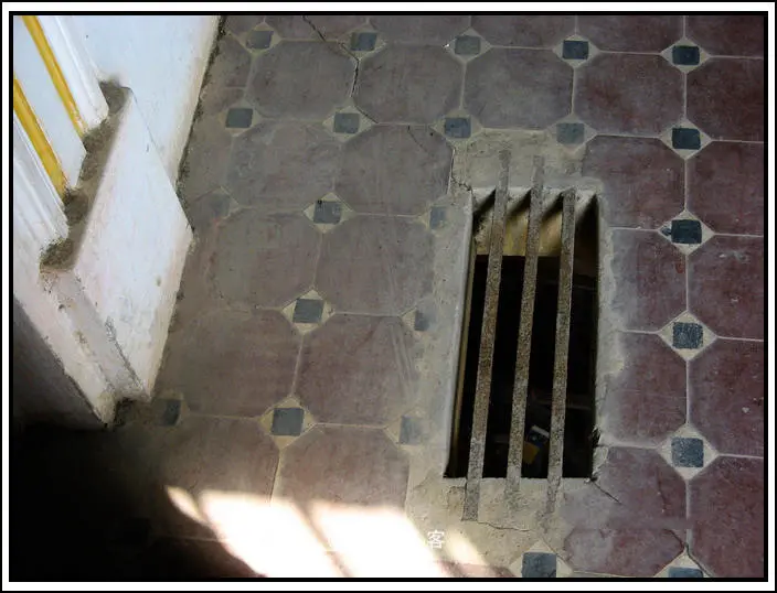 来到二楼,楼梯口有扇厚重的铁板,大小正好可以盖住楼梯口,二楼地面有一类似瞭望口的小孔正对着上楼的楼梯。