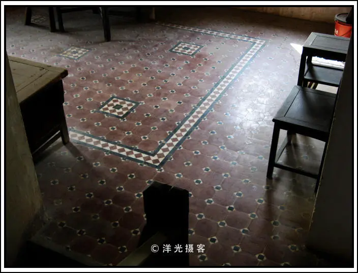 二楼地面的瓷片拼花非常精致。开平碉楼基本都是混凝土包青砖的,所以特别结实,至于建筑材料,除了青砖是本土产外,其他的重要材料如铁枝、铁板、水泥等,全是从国外进口,因此,建碉楼,也是一种财富的炫耀。