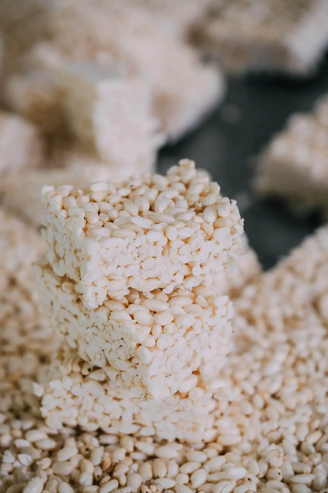 由現場工作人員帶領將冷泉米放進滾動壓力爐,經加熱的米粒飽含壓力,一開蓋,水分瞬間化作氣體噴爆而出,濃郁香氣溢滿鼻腔,趁熱把米香和入滾燙的麥芽糖漿,用巧勁攪拌均勻,放進鐵盤上切割冷卻,就是令人愛不釋手的爆米香。